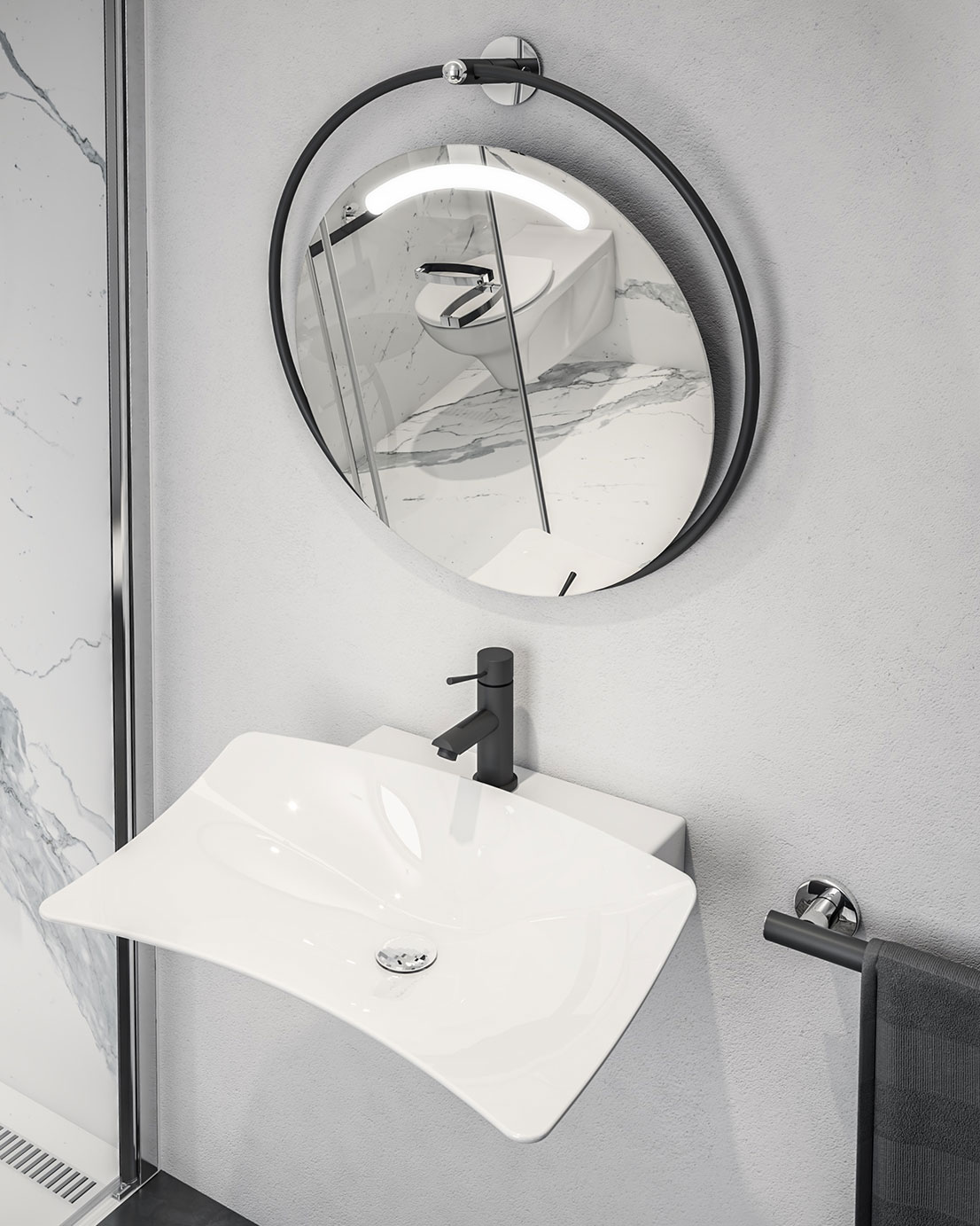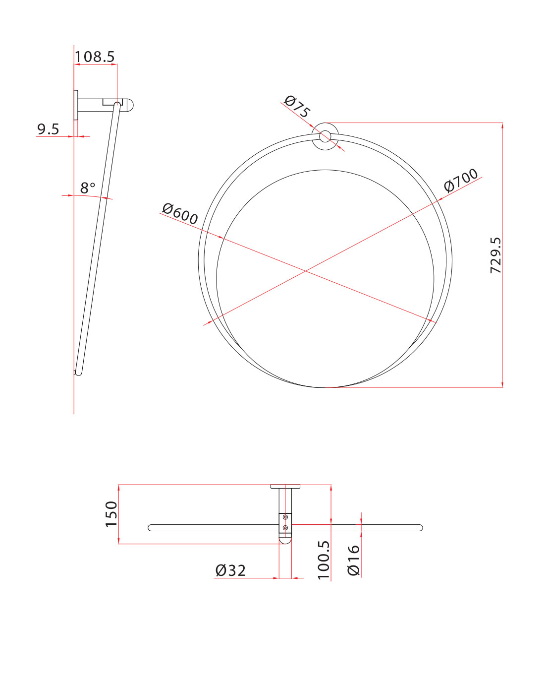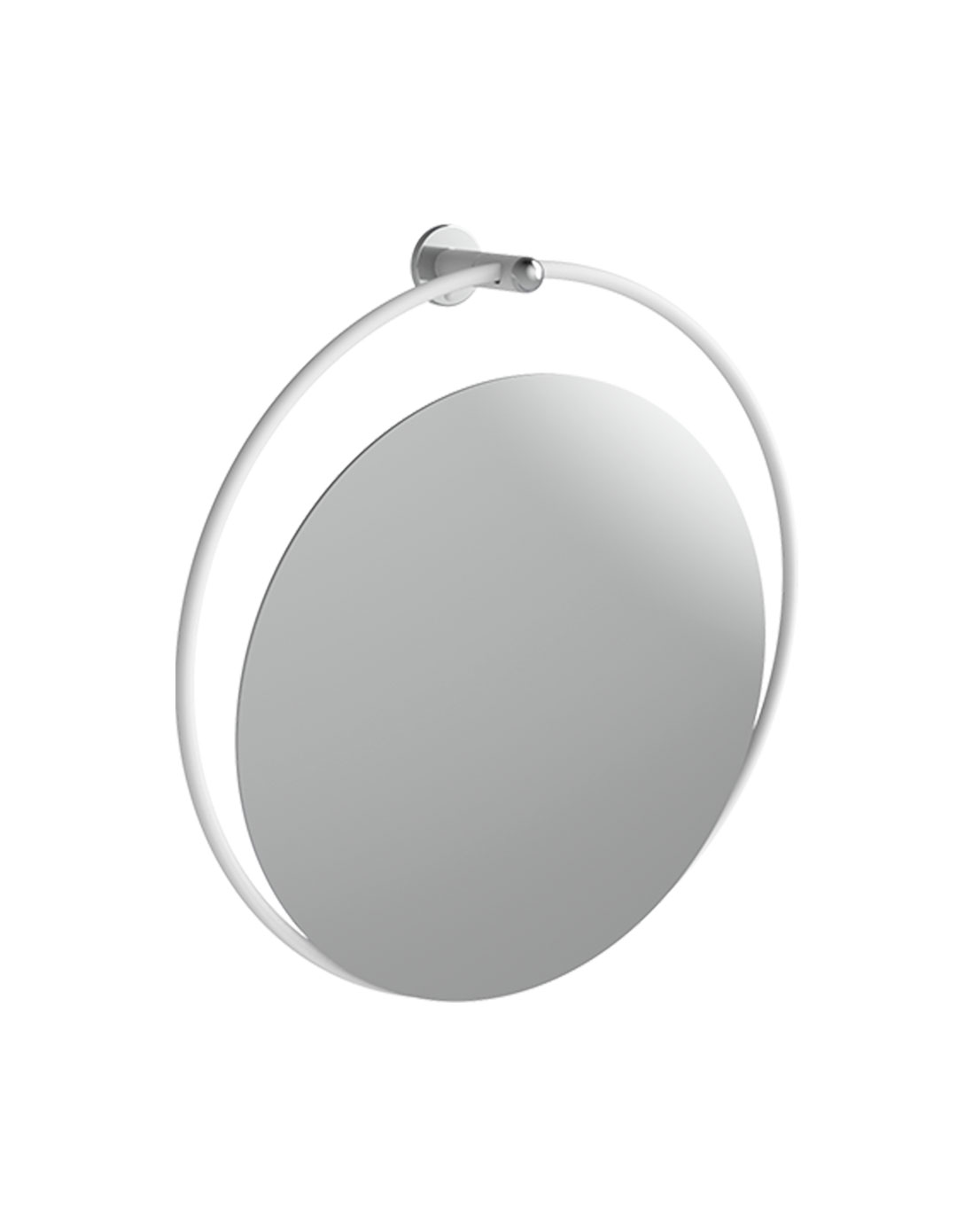 Kallistettava pyöreä peili ø 60 cm, tukevalla putkirungolla ø 70 cm. Runko on valmistettu kahdesta osasta pyöreää alumiiniputkea ø 16 mm, joissa on korroosionestokäsittely ja epoksipolyesteripinnoite. Pakkauksessa myös ruostumattomasta teräksestä valmistettu seinäkiinnitystappi, AISI 430, galvaanisella viimeistelyllä. Putkirunko värillinen ja muut osat krominvärisiä. Saatavana myös LED-valolla.