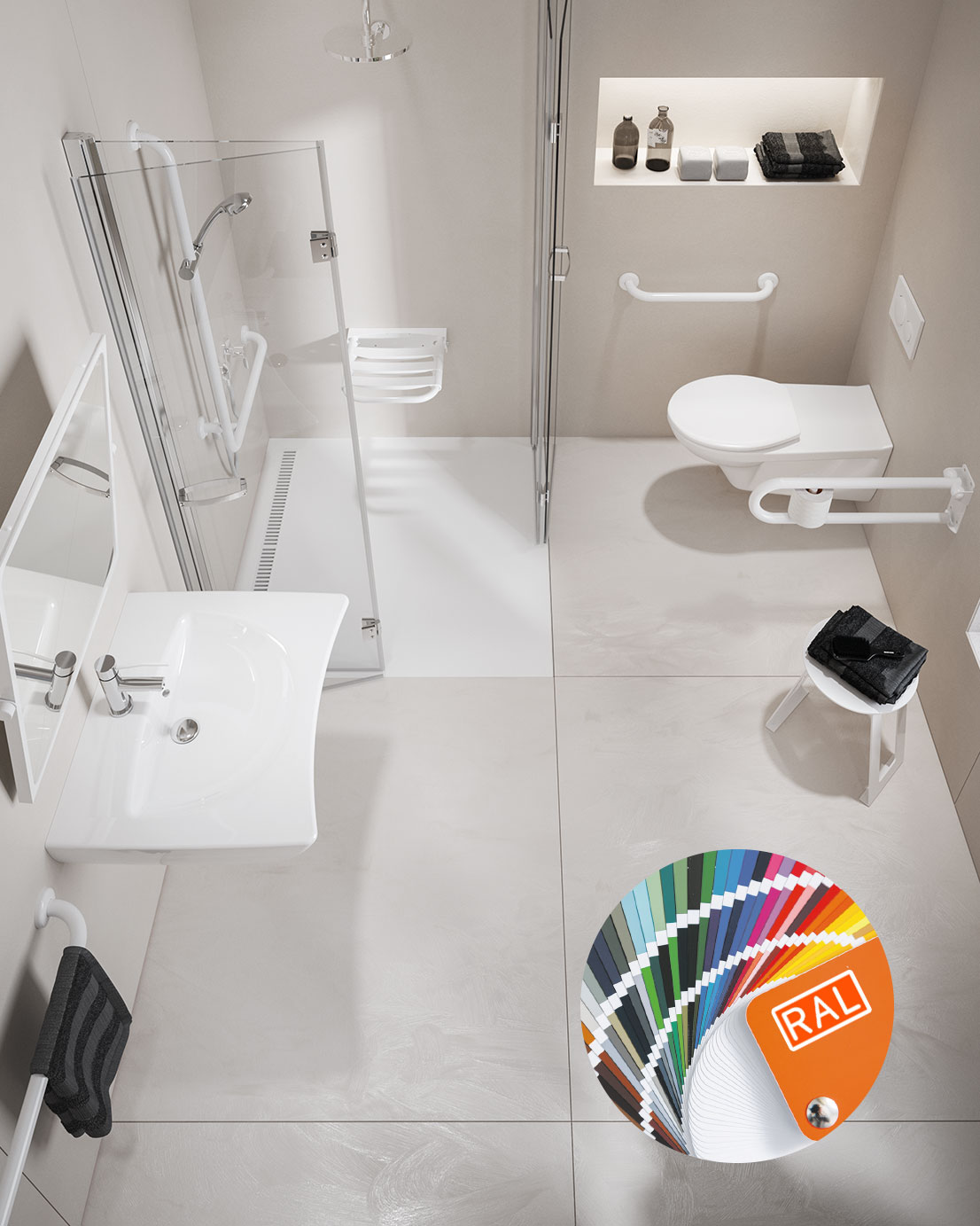 • Antibakteerinen, hopea-ionisoitu käsittely vakiona väreissä: kiiltävä valkoinen (RAL9016), kiiltävä harmaa (RAL7035) ja kiiltävä musta (RAL9005). Hopeaionit on sekoitettu suoraan väriaineeseen.
