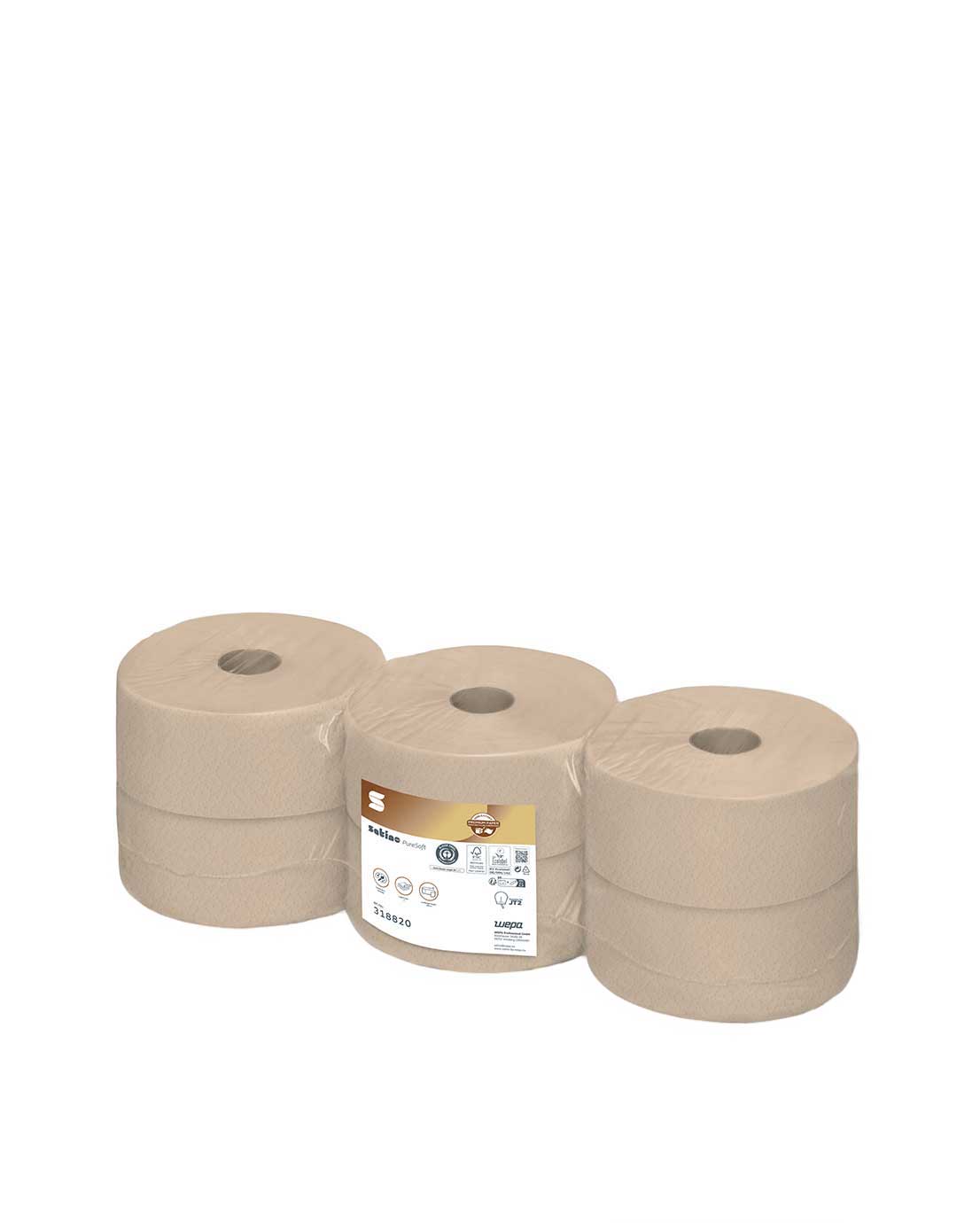 Satino PureSoft on markkinoiden ensimmäinen WC-paperi, joka valmistetaan 100 % kierrätyskuiduista – kartongista ja pakkausmateriaaleista. Luonnollinen soft beige -sävy näyttää hyvältä ja viestii vastuullisuutta heti ensisilmäyksellä. Pehmeä, hyvin imevä ja vahva materiaali tekee siitä hyvän valinnan julkisiin WC-tiloihin, joissa halutaan vähentää ympäristökuormaa tinkimättä käyttömukavuudesta.