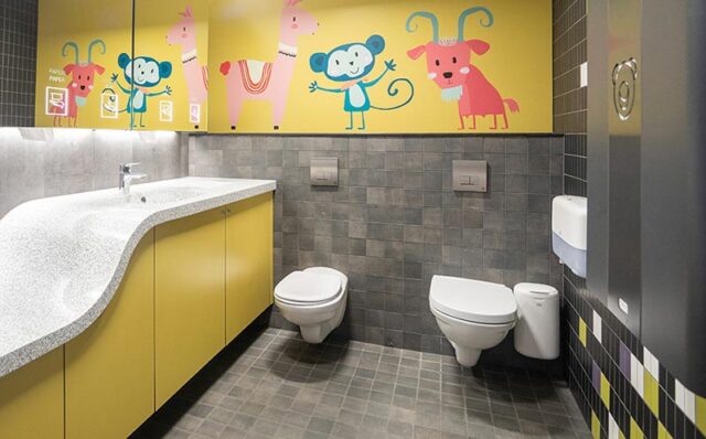 Lämpimän keltaiset Novosan-allaskaapit on valmistettu mittatilauksena umpilaminaatista. Pieni lapsi voi pestä kädet itse kauppakeskuksen vessassa, sillä allaskaapin käsienpesuallas on matalampi toisesta päästä.